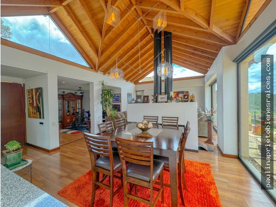 Conjunto residencial a las afueras de la ciudad ofrece casa de 2 niveles con vista hacia las montañas y laguna, tiene una sala amplia con chimenea a gas, comedor, cocina y salida a balcón, baño social, cuarto del servicio con baño, patio de ropas con lavadero, espacio para biblioteca debajo de las escaleras, oficina con chimenea y balcón, 4 habitaciones grandes cada una con su baño privado y calefacción, ppal con walk in closet y balcón, sala de TV tambien con chimenea, hall de alcobas con estudio, bodega para vinos y trago, 3 garajes cubiertos, 2 depósitos.