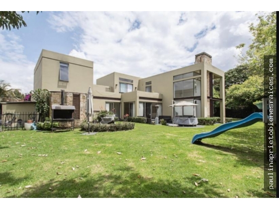 Área verde, campestre y residencial, propone una arquitectura de diseño exclusivo con acabados de lujo perfecto para un ambiente familiar lleno de armonía y tranquilidad. Casa esquinera de tres niveles con sala amplia de triple altura,  ventanales de piso a techo y chimenea a gas, comedor independiente con plancha teppanyaki, comedor auxiliar y cava de vinos, cocina abierta, sala de TV, 3 habitaciones grandes con vestier y baño privado cada una, ppal con tina, terraza y sala, tiene una oficina con salida independiente a la calle puede adecuarse para otra habitación tiene baño, vestier y terraza, zona húmeda con dos vestier, dos sanitarios, doble lavamanos, jacuzzi, solaruim, ducha, turco, hermosa vista al jardín y salida a terraza, cuarto y baño del servicio, área de lavandería y deposito independiente de la casa, espacio para gimnasio, conector para carro eléctrico,4 garajes cubiertos.