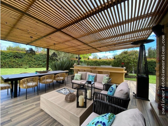 Moderna casa de 2 pisos a las afueras de la ciudad en lote plano, rodeada de amplio jardín, ofrece espacios bien definidos con buena iluminación tiene sala, comedor doble altura, independientes con chimenea de leña, cocina con isla, cuarto y baño del servicio, área de ropas, sala de T.V. con chimenea también, baño social, salida a terraza cubierta con pérgola y BBQ, habitación con baño completo, 3 parqueaderos cubiertos y 2 descubiertos, 2 depósitos grandes, en el segundo piso encontramos: 3 habitaciones cada una con baño privado, ppal con balcón, hall de alcobas, estudio o biblioteca.